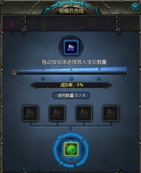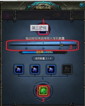 2.数量控制滑块:拉动这个滑块,可以控制投入祝福石的数量,最少为1颗,最多为4颗,投入数量不同,合成的成功率也不同。