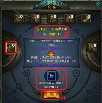 当祝福达到4级或以上时,达到下一级祝福需要进行分步操作。依次使用4枚晶莹的祝福石,可将一个部位从祝福4级提升到祝福5级,每次分步祝福都将分步提升祝福效果。